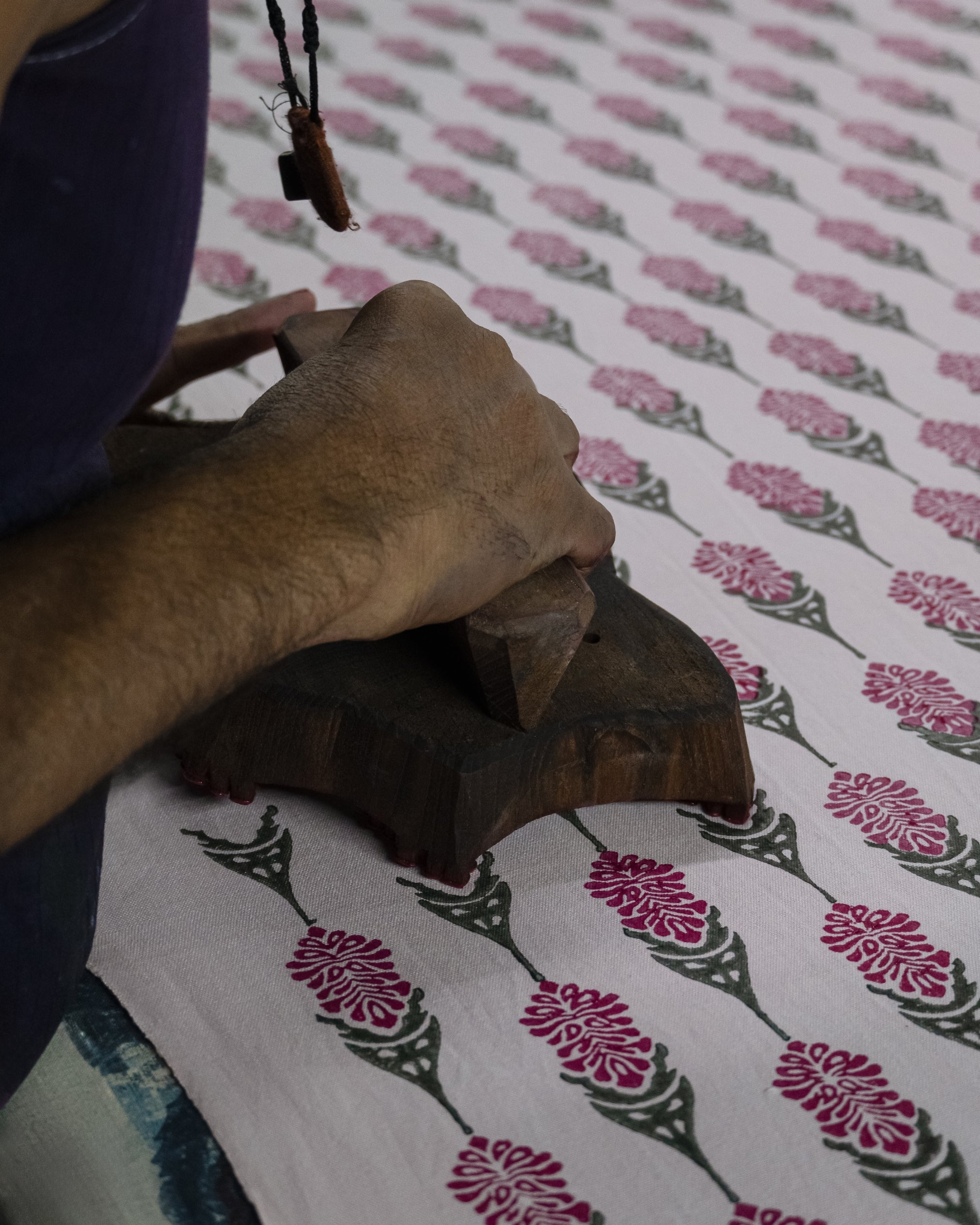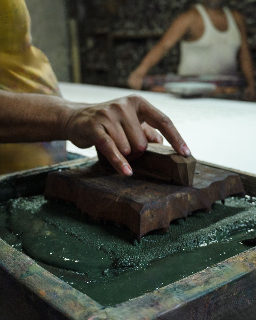 Our designs are first converted into stenciled screens by our artisans in Maharashtra. The screen acts as a negative, allowing the mixed dye to be pushed through with a rubber blade, imprinting the fabric with precision.